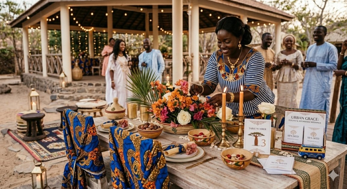 Privilégie la cuisine familiale. Un thiéboudienne préparé par les femmes de la famille est souvent meilleur qu'un buffet de traiteur — et coûte 3 à 5 fois moins cher. La cuisine familiale n'est pas "moins bien" — c'est authentiquement sénégalais.