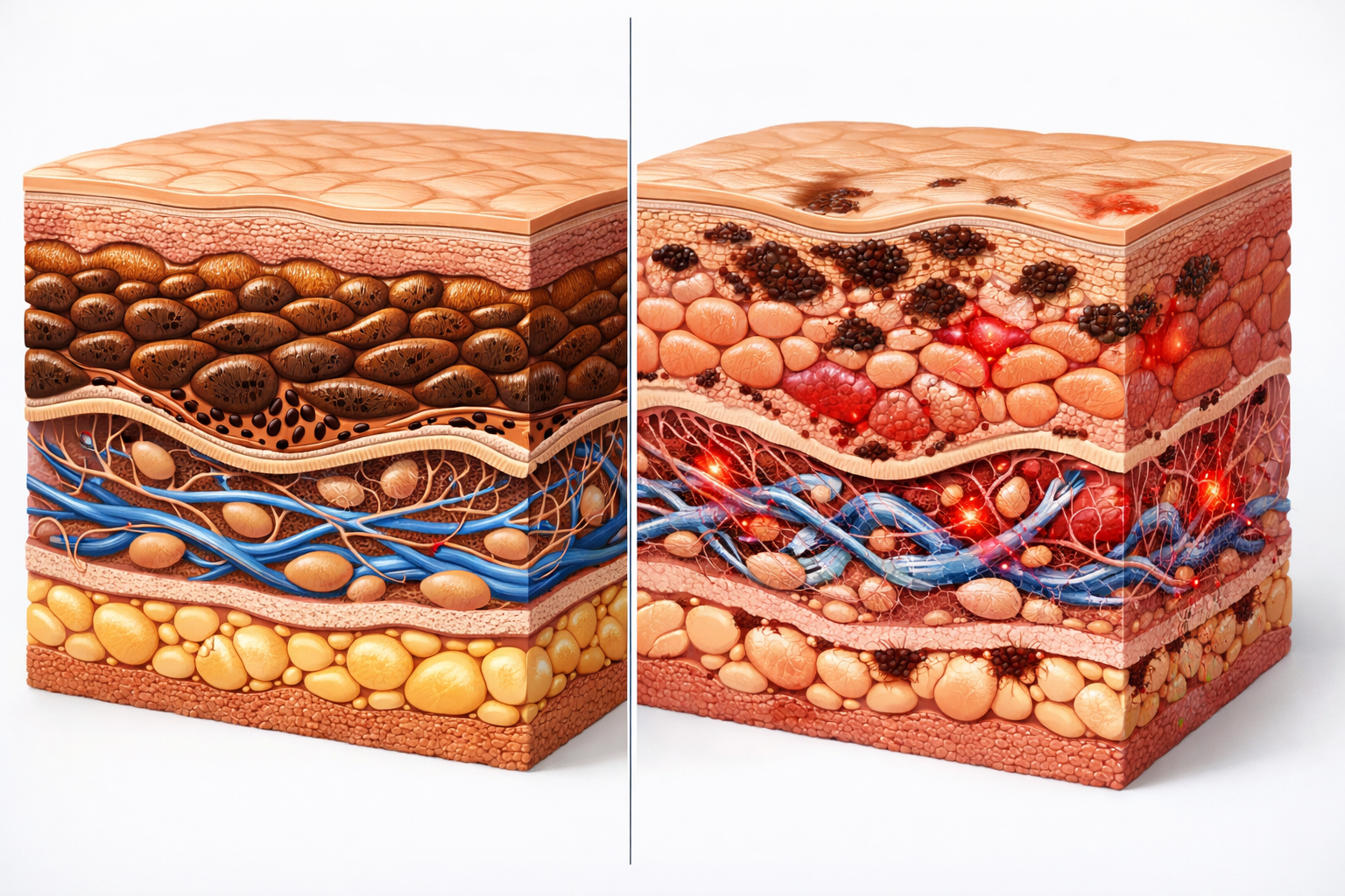 Les dyschromies (irrégularités de couleur) touchent environ 17,5% des utilisatrices selon les études dermatologiques menées à Dakar. La peau devient un patchwork de zones claires et sombres, donnant un aspect tacheté impossible à uniformiser.