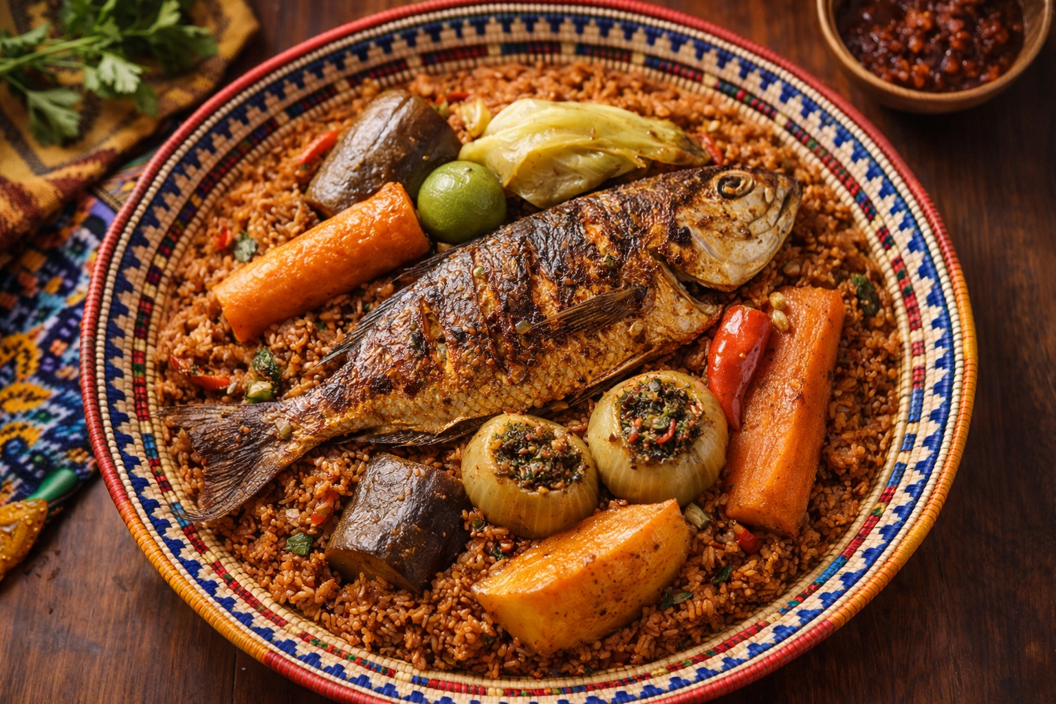 Le thiéboudienne, c'est sacré. C'est le déjeuner de millions de familles sénégalaises chaque jour. C'est le plat autour duquel on se retrouve, assis en cercle, la main droite dans le riz, les yeux rivés sur le meilleur morceau de poisson. Inscrit au patrimoine culturel immatériel de l'UNESCO depuis 2021, le « ceebu jën » est bien plus qu'un repas — c'est une identité.