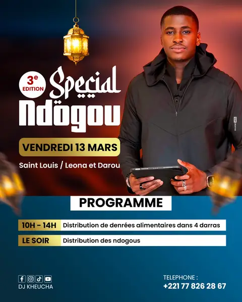 Cette année encore, par la grâce de Dieu, j’organise la 3ᵉ édition de mon Ndogou à Saint-Louis. Un moment de partage et de solidarité pour offrir des dons alimentaires aux daaras et aux personnes démunies, afin qu’ils puissent rompre le jeûne dignement pendant ce mois béni. 🤲🏾 Ensemble, faisons parler nos cœurs. Même un petit geste peut nourrir beaucoup de sourires. 👉 Tous ceux qui souhaitent participer ou apporter leur contribution peuvent nous contacter au numéro suivant : [778262867 ].#djkheucha #viral #tiktoksenegal🇸🇳 #lesideesdekheucha