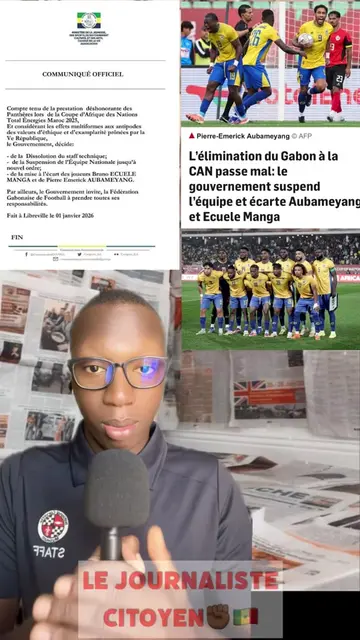 COMMUNIQUÉ OFFICIEL Compte tenu de la prestation déshonorante des Panthères lors de la Coupe d'Afrique des Nations Total Energies Maroc 2025, Et considérant les effets multiformes aux antipodes des valeurs d'éthique et d'examplarité prônées par la Ve République, le Gouvernement, décide: - de la Dissolution du staff technique; - de la Suspension de l'Equipe Nationale jusqu'à nouvel ordre; - de la mise à l'écart des joueurs Bruno ECUELE MANGA et de Pierre Emerick AUBAMEYANG. Par ailleurs, le Gouvernement invite, la Fédération Gabonaise de Football à prendre toutes ses responsabilités. Fait à Libreville le 01 janvier 2026 #tiktoksenegal🇸🇳 #senegal #pourtoi #information #senegalaise_tik_tok🇸🇳pourtoichallenge
