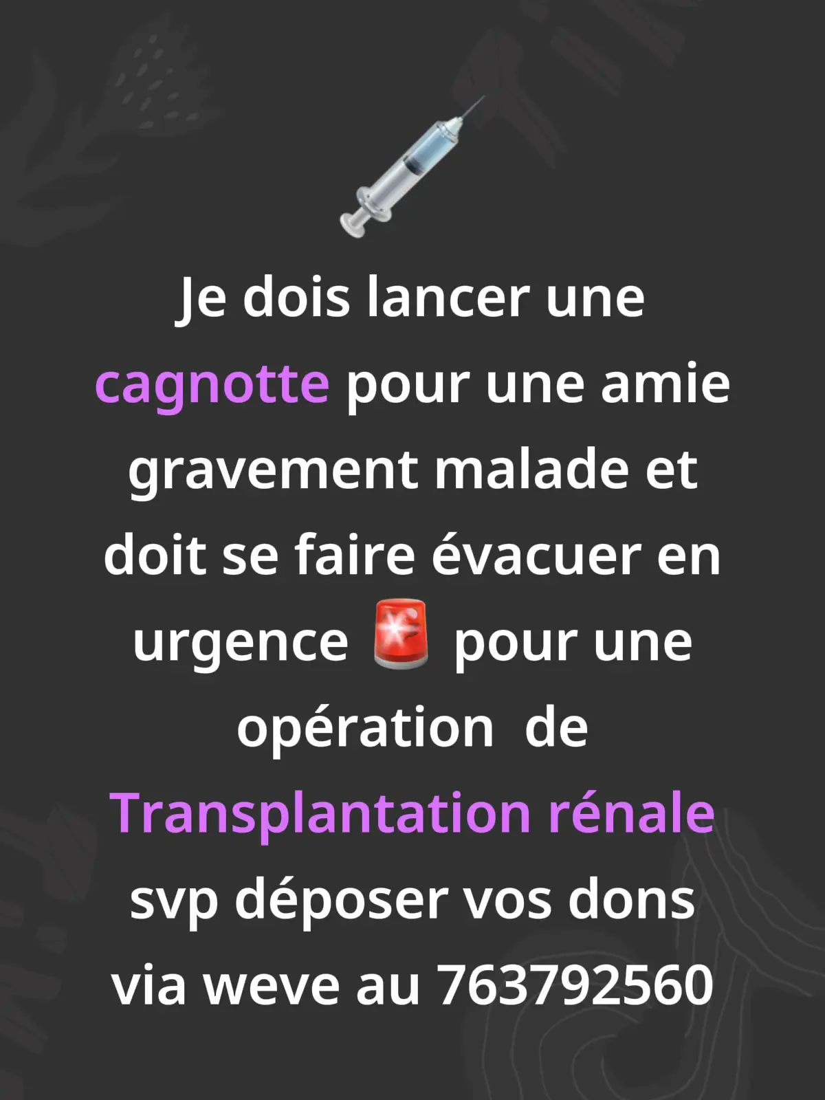 Je lance cette cagnotte pour venir en aide une amie dont sa vie est en danger , elle doit se faire évacuer en urgence pour une opération de Transplantation rénale qui est très coûteux raison pour laquelle je vous demande chers amis d’interroger vos cœur et participe avec le peux que vous pouvez merci bien de votre compréhension #pourtoi #fyp #viral #foryoupage❤️❤️