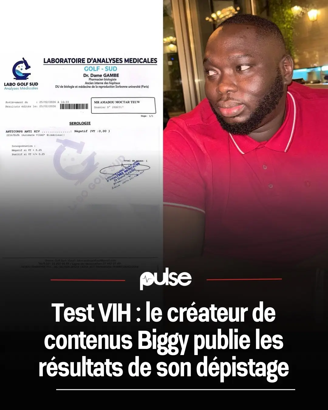 Le créateur de contenus Biggy a rendu publics les résultats de son test de dépistage du VIH, qui se sont révélés négatifs. #pulsenewsreels #sinformersurtiktok