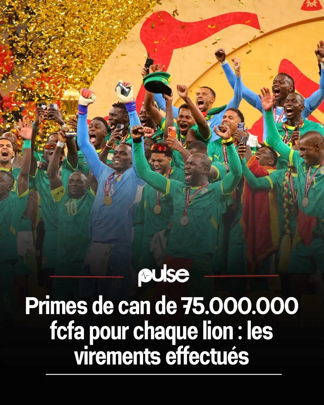 Le gouvernement a tenu parole ! Les joueurs de l'équipe nationale de football, les Lions, ont reçu une prime de 75 millions de FCFA chacun pour leur participation à la CAN. Le premier virement a déjà été effectué et le deuxième suivra bientôt. Les Lions sont actuellement en préparation pour leur prochain match contre le Pérou et la Gambie. Voici les détails : - Prime de 75 millions de FCFA pour chaque joueur - Premier virement déjà effectué - Deuxième virement en cours de préparation - Préparation pour les matchs contre le Pérou et la Gambie SOURCE A #pulsenewsreels #sinformersurtiktok