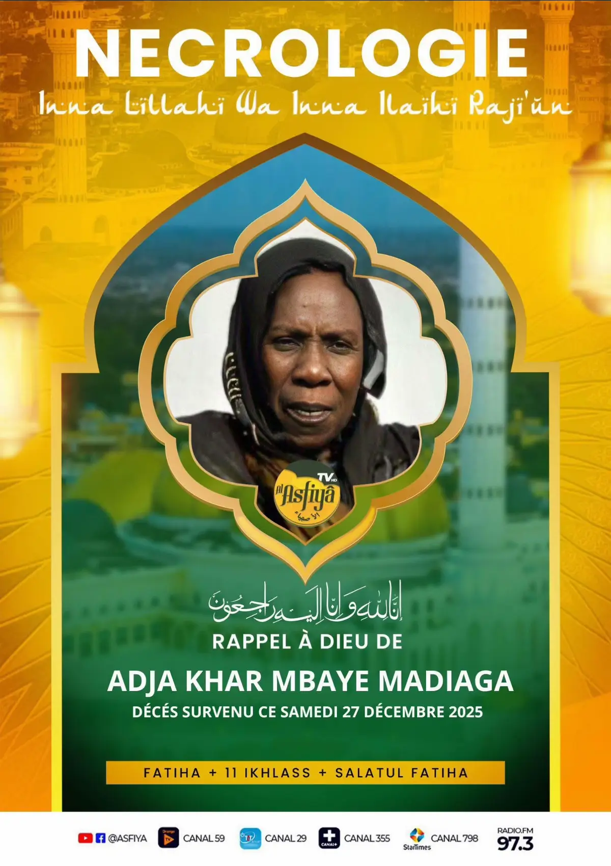 le monde de la musique sénégalaise a appris le décès, ce samedi, de Khar Mbaye Madiaga, grande figure de la chanson traditionnelle et véritable icône culturelle du pays. À travers sa voix et son engagement pour la préservation du patrimoine musical, elle a marqué des générations entières. Toutes mes condoléances à la famille éplorée et surtout à la culture sénégalaise.🕊️❤️