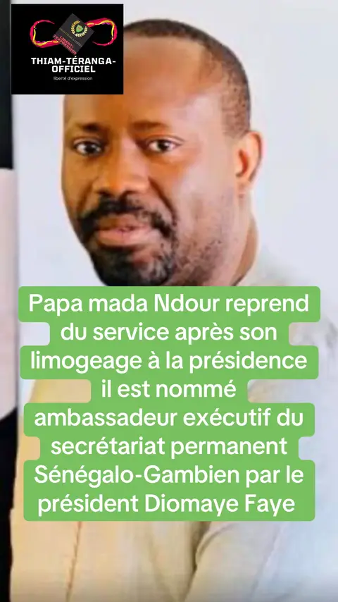 Moins d'un an après son éviction, Papa Mada Ndour effectue un retour remarqué sur la scène diplomatique. Le Chancelier des Affaires étrangères vient d'être nommé Ambassadeur, Secrétaire exécutif du Secrétariat permanent Sénégalo-Gambien par le président Bassirou Diomaye Faye. Il succède à Monsieur El Hadji Ibou Boye, appelé à faire valoir ses droits à une pension de retraite. Ce retour aux affaires intervient dans un contexte particulier. En effet, Papa Mada Ndour avait été limogé de son poste de Chef de cabinet à la Présidence de la République il y a quelques mois seulement.#pourtoi #fyp #viral #senegal