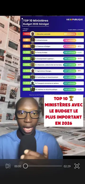 Voici le Top 10 des ministères par dotation budgétaire: 1️⃣ Éducation nationale 990 milliards FCFA 2️⃣ Infrastructures 716 milliards FCFA 3️⃣ Finances et Budget 676 milliards FCFA 4️⃣ Forces armées 338 milliards FCFA 5️⃣ Enseignement supérieur, Recherche et Innovation 301 milliards FCFA 6️⃣ Urbanisme, Collectivités territoriales et Aménagement des territoires 250 milliards FCFA 7️⃣ Agriculture, Élevage et Souveraineté alimentaire 247 milliards FCFA 8️⃣ Hydraulique et Assainissement 244 milliards FCFA 9️⃣ Transports terrestres et aériens 237 milliards FCFA 🔟 Intérieur et Sécurité publique 220 milliards FCFA Source: Loi de finances initiale 2026 du Sénégal (crédits de paiement) #tiktoksenegal🇸🇳 #senegalaise_tik_tok🇸🇳pourtoichallenge #senegal #pourtoi #information